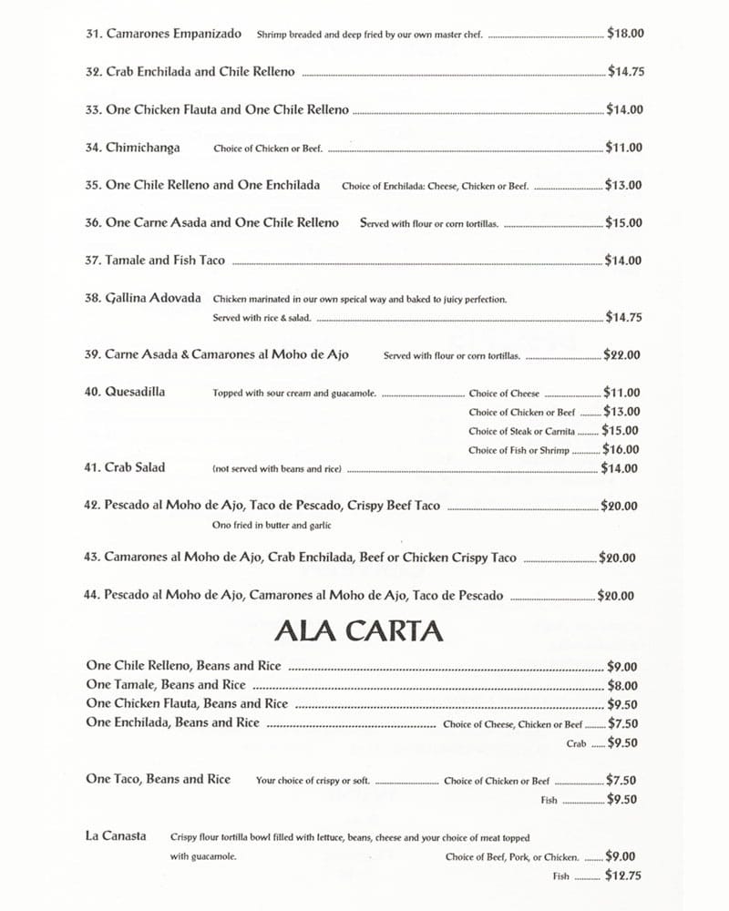 Camarones Al Moho De Ajo, Crab Enchilada, Beef or Chicken Crispy Taco